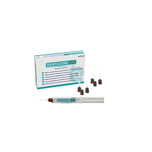 DentoCore Body. Composite de reconstitution de moignons et de scellement des tenons. Polymérisation duale libération de fluorures Compatible avec tous les adhésifs Bis-GMA Consistance plus ferme que le DentoCore classique, pour une mise en œuvre plus aisée, sans condensation – Forte résistance à la compression. – Mélange homogène et constant – Radio-opaque – Se travaille comme la dentine Le coffret Automix comprend : 1 seringue de 5 ml teinte A3 – 10 embouts mélangeurs – 10 embouts intra-oraux – 10 embouts intra-oraux extra-fins.